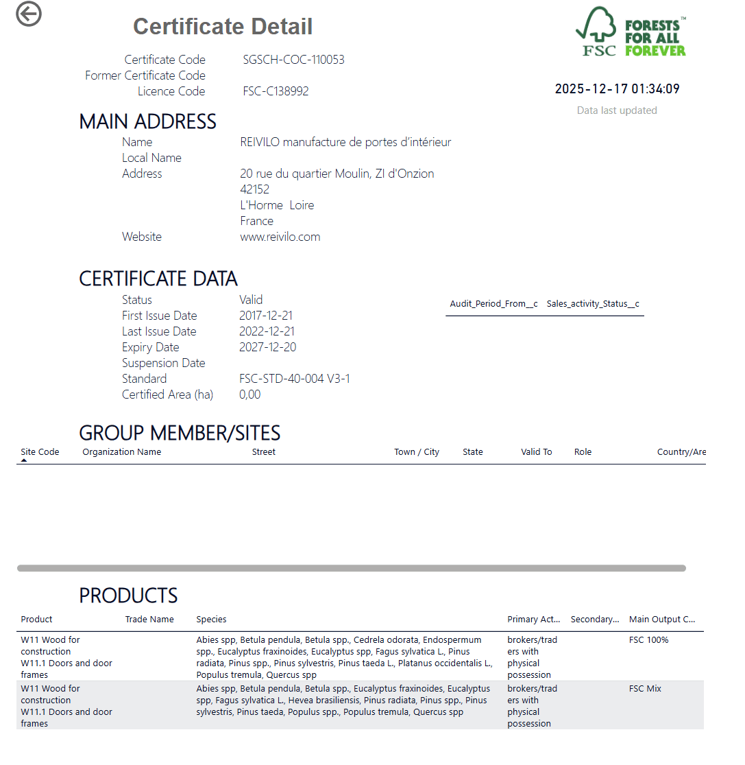 La production Reivilo a reçu les certifications écologiques FSC 100% par SGS (Société Générale de Surveillance).